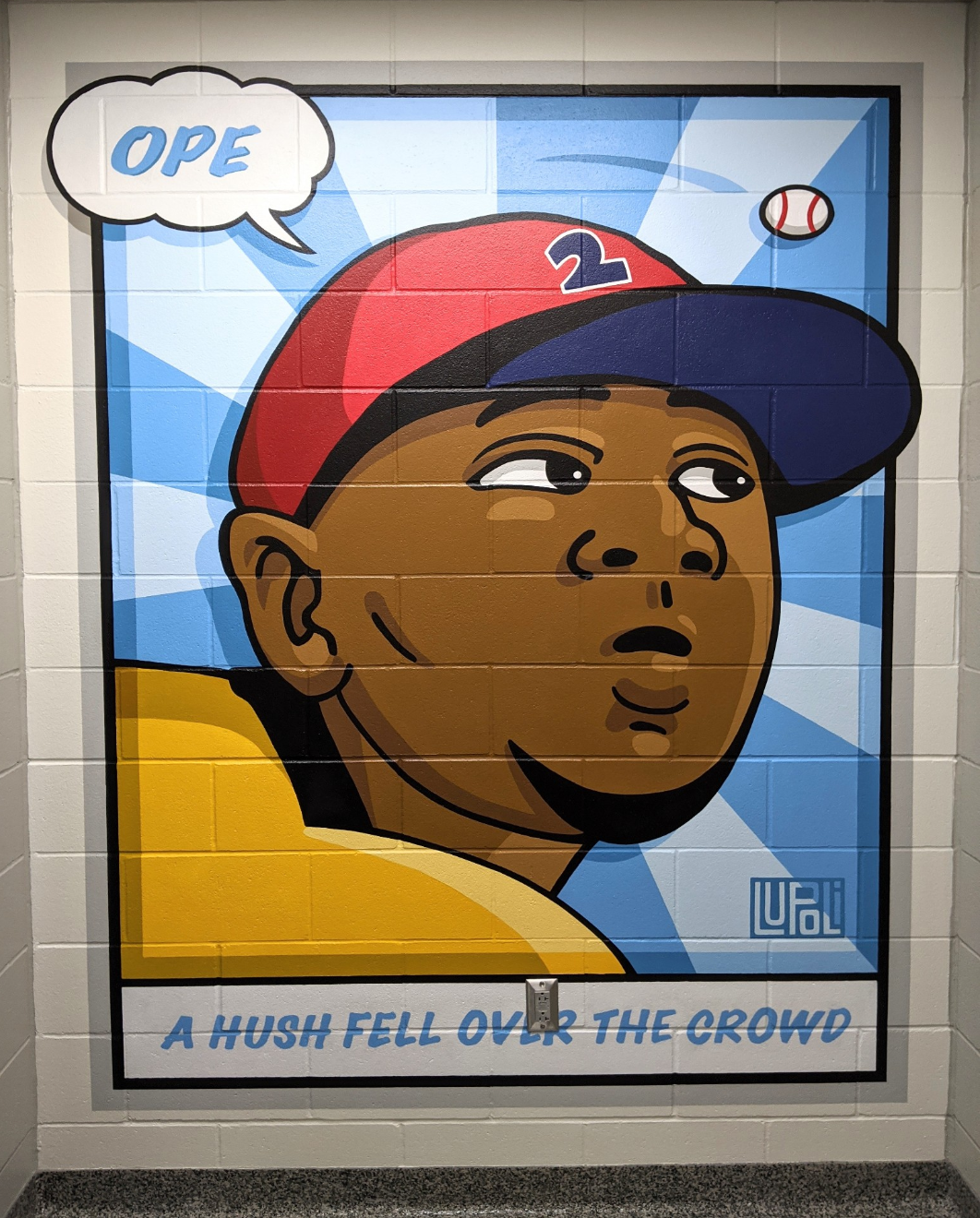“A Hush Fell Over the Crowd” Lupoli Collective, 2020, acrylic; Riverfront Baseball Stadium, Wichita, KS.